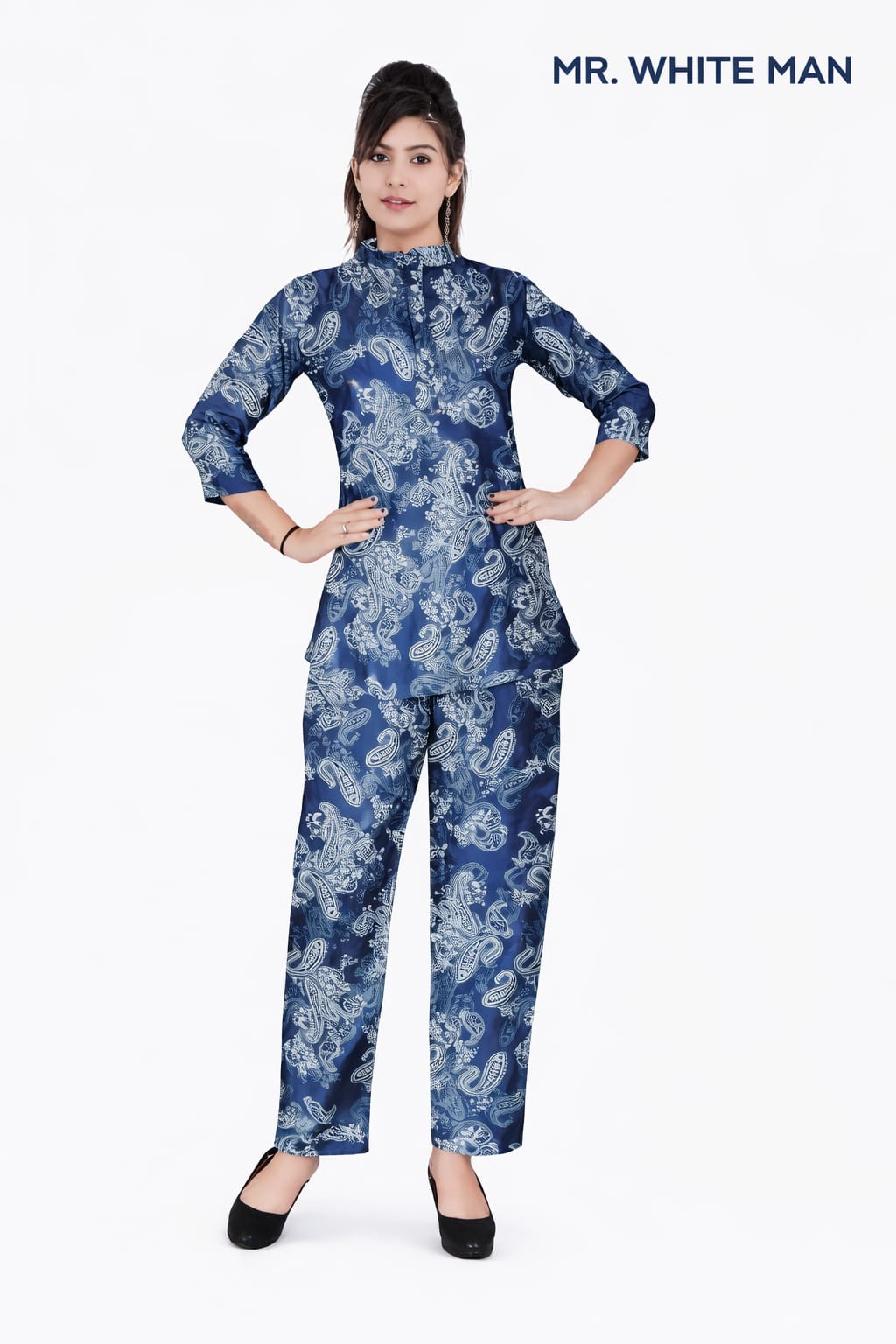 Blue color white flower night wear women's